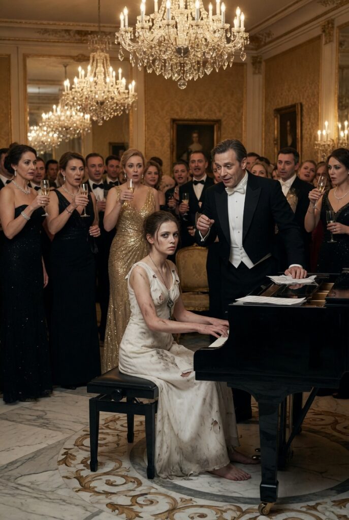 Her white dress was torn at the hem, stained with dust and time. Dirt marked her arms, her face, her knees. Her hair fell unevenly around her shoulders, as though it had been cut without care. And yet—despite everything—there was something steady in the way she sat, something unyielding in the way her small hands hovered above the keys.
