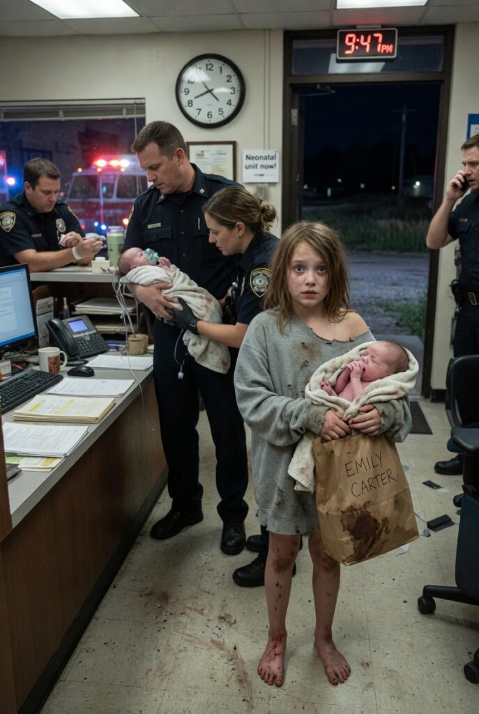 Her name was Emily Carter, and she stood in the doorway of the Cedar Hollow Police Department with bleeding feet, a torn gray sweatshirt hanging off her shoulders, and a crumpled paper bag pressed so tightly to her chest that her knuckles had gone white.