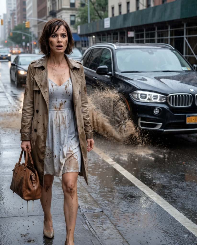 Cold, muddy water hit me full force—soaking my light-colored dress, splashing across my bag, and even striking me across the cheek.